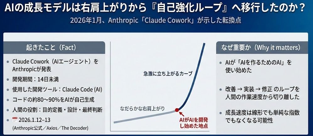AIがAIを作る。この「自走開発」のフェーズに突入したことで、進化の速度はもはや「スピードアップ」という言葉では形容できない段階に達しています。
